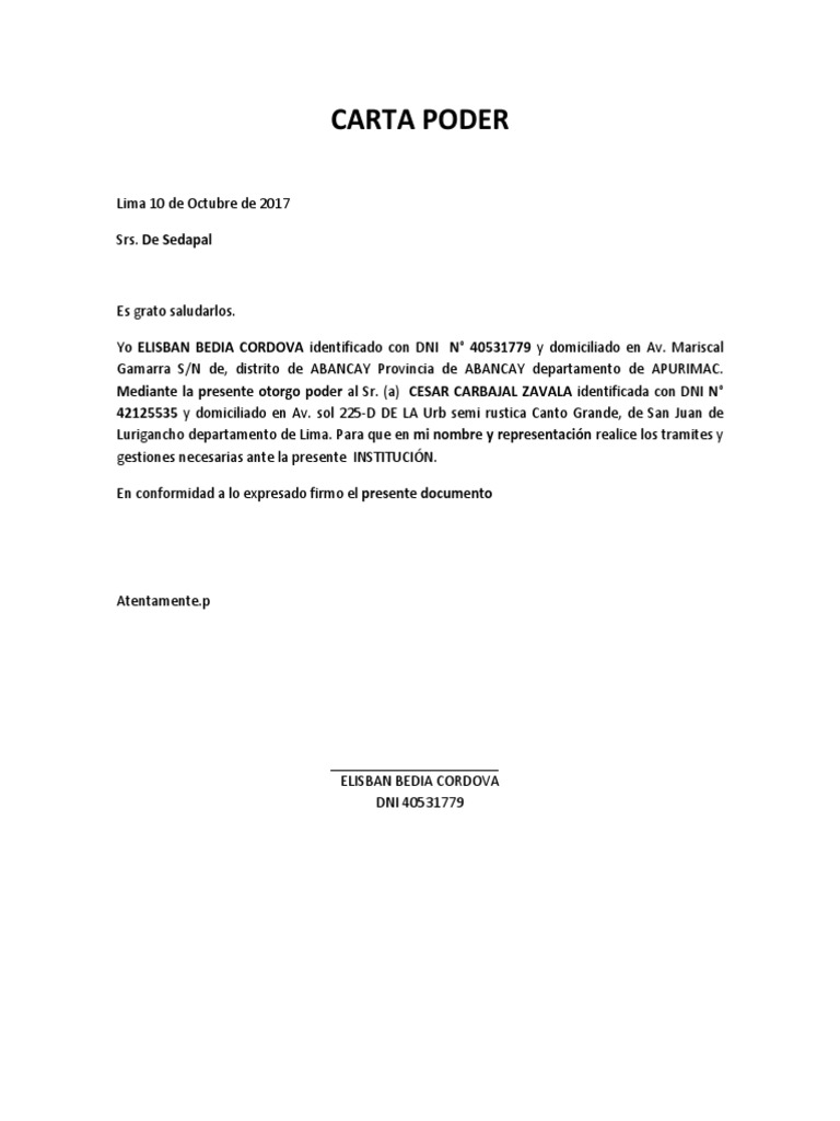 Se explica qué es y para que sirve la carta poder simple, junto algunos ejemplos prácticos de casos ficticios, en los que aparecen los datos, ordenados en la disposición que requiere este tipo de documento. Nombre y apellidos de quién da el poder (otorgante). Aquí disponemos de la plantilla en blanco para llenar con nuestros datos y después poder imprimir. Nombre y apellidos de la persona que recibe y acepta el poder (apoderada). Descubre todos nuestros ejemplos de carta poder aquí: